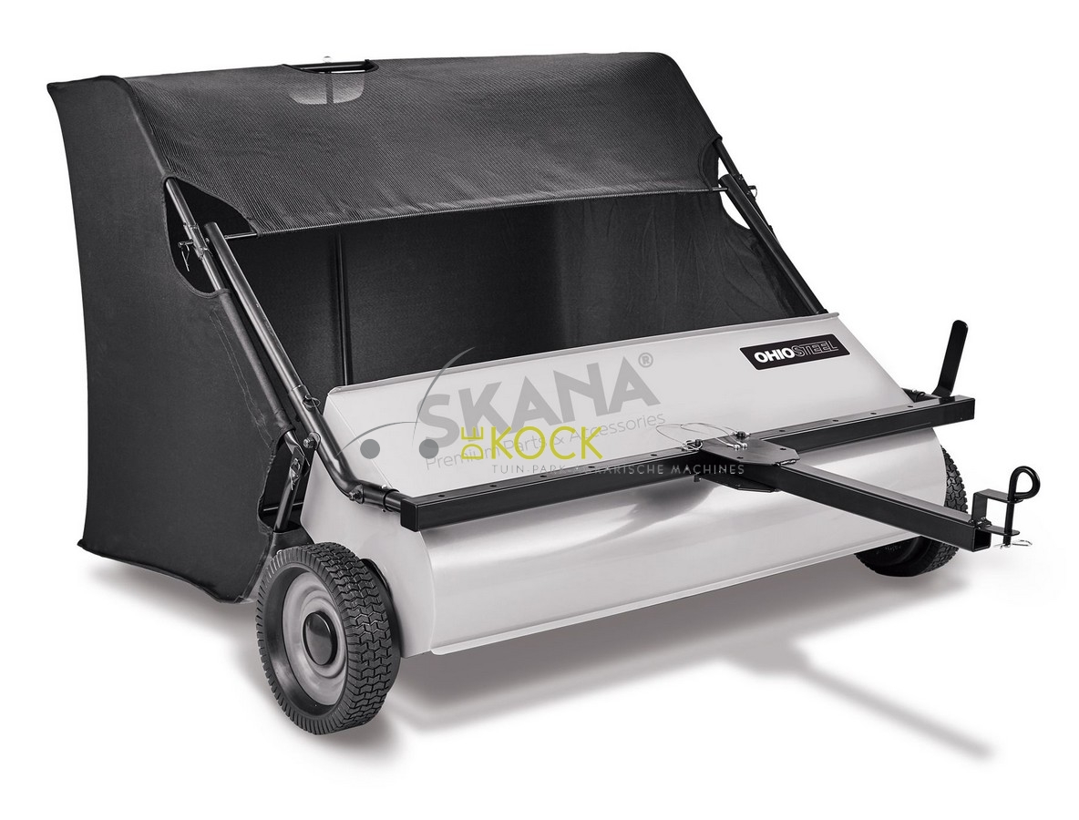 42″ veegmachine. XL opvangzak met easy-dump systeem (leegmaken vanaf tractor-zetel dmv koord). Gepatenteerde spiraalvormige borstel voor efficiënter vegen en minder slijtage aan tandwielen. Verstelbare werkhoogte. Verstelbare aanhang-boom : mogelijk om buiten het tractor-spoor te vegen. Opvouwbare aanhang-boom voor verticale opslag. 4,5 / 1 tandwiel-verhouding. Opvangzak 420 l.